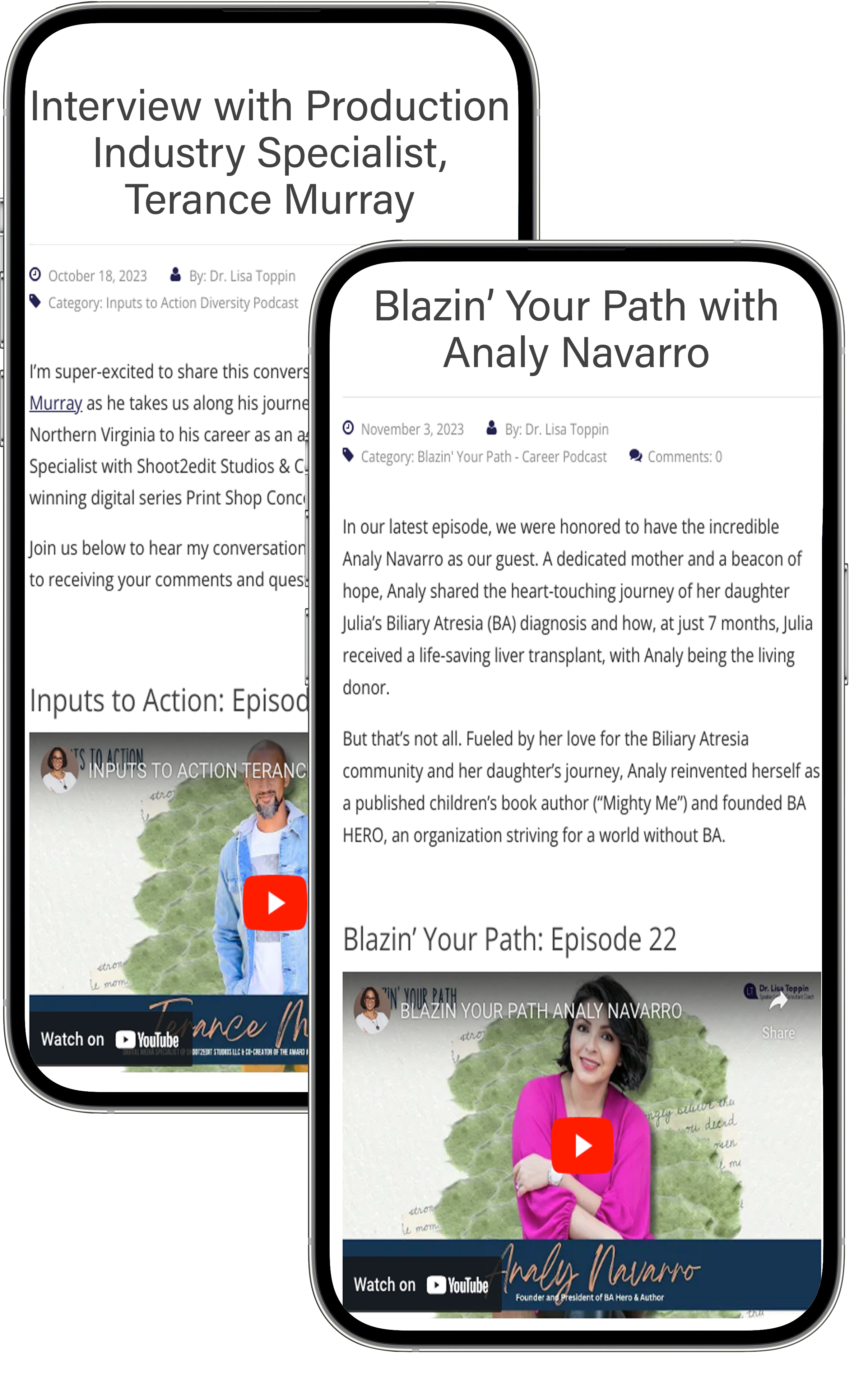 Explore leadership and DEI insights with Dr. Lisa Toppin through her engaging podcasts and insightful blog. Discover ‘Blazin’ Your Path,’ where powerful stories of women achieving success in diverse fields are highlighted, and ‘Inputs to Action,’ which showcases individuals making significant impacts in their communities. Each podcast episode is crafted to inspire and empower listeners to make meaningful changes.Dr. Lisa’s blog further explores these themes by addressing real-world DEI challenges, management strategies, and personal development in the workplace. Enhance your understanding and skills in creating inclusive environments by diving into her rich, accessible content. Join Dr. Lisa in transforming insights into action with every post and episode.
